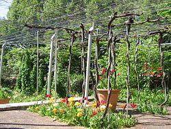The "Jardin de la Treille" (Trellis Garden) designed by Gilles Vexlard and Laurence Vacherot. Vines and creepers are going along a roof trellis and 90 small fountains designed so that you only really hear the murmur of them in between the grape vines. 7 Sculptures de visées (Sculptures Bachelard) by Jean-Max Albert[8] are installed all around and an anamorphosis reflection is displayed in a small pool.[9]