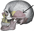 Side view of the cranium. Squamosal suture in red. | |
