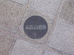In 1994 the Arago Association and the city of Paris commissioned a Dutch conceptual artist, Jan Dibbets, to create a memorial to Arago. Dibbets came up with the idea of setting 135 bronze medallions (although only 121 are documented in the official guide to the medallions) into the ground along the Paris meridian between the northern and southern limits of Paris: a total distance of 9.2 kilometres/5.7 miles. Each medallion is 12 cm in diameter and marked with the name ARAGO plus N and S pointers.