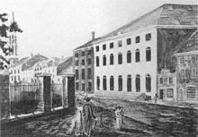 The section of Manhattan where the theatre stood was not stylish: the New Theatre, as it was called, was neighbor to Bridewell Prison, a tent city's worth of squatters, and the local poorhouse.[5] Lewis Hallam, Jr., and John Hodgkinson, both members of the John Street Theatre company, obtained the building's lease. They hired remnants of the Colonial Old American Company to form the nucleus of the theatre's in-house troupe and thus give the establishment the sheen of tradition and American culture.[6] Meanwhile, the men quarreled, and construction continued languorously. The theatre finally held its first performance on January 29, 1798, despite still being under construction. The gross was an impressive $1,232, and, according to theatre historian T. Allston Brown, hundreds of potential patrons had to be turned away.[7]