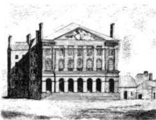 In the late 18th century, New York's only playhouse was the decaying and increasingly low-brow John Street Theatre. Tired of attending such an establishment, a group of wealthy New Yorkers began planning the construction of a new playhouse in 1795.[1] Investors bought 113 shares at $375 each to cover the estimated $42,375 cost. To plan the structure, the owners hired celebrated architect Marc Isambard Brunel, a Frenchman who had fled to New York to avoid the Reign of Terror and was then the city's engineer. Part way through construction, however, the project ran out of money. The owners sold more shares for what would eventually mount to a construction cost of more than $130,000.[2] As a cost-saving measure, Brunel's exterior design for the building was not implemented. The resulting three-story structure measured 80 feet (24 m) wide by 165 feet (50 m) deep and was made of plain dressed stone. The overall effect was an air of austerity.[3] The interiors, on the other hand, were quite lavish. The building followed the traditional European style of placing a gallery over three tiers of boxes, which overlooked the U-shaped pit.[4]