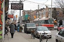 The area has a vibrant storefront commercial strip along Queen Street West that has seen an increase in restaurants and bars in the 2010s, increasing to the point that planning controls were put in place on the opening of new restaurants and bars from 2012.[4]