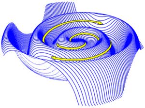 The influence of this spiral-shaped magnetic field on the interplanetary medium (solar wind) creates the largest structure in the Solar System, the heliospheric current sheet. Parker's spiral magnetic field was divided in two by a current sheet,[8] a mathematical model first developed in the early 1970s by Schatten. It warps into a wavy spiral shape that has been likened to a ballerina's skirt.[9][10] The waviness of the current sheet is because of the magnetic field dipole axis' tilt angle to the solar rotation axis and variations from an ideal dipole field.[11]