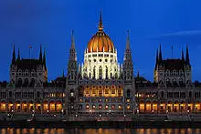 The Diet of Hungary or originally: Parlamentum Publicum / Parlamentum Generale[43] (Hungarian: Országgyűlés) became the supreme legislative institution in the medieval kingdom of Hungary from the 1290s,[44] and in its successor states, Royal Hungary and the Habsburg kingdom of Hungary throughout the Early Modern period. The name of the legislative body was originally "Parlamentum" during the Middle Ages, the "Diet" expression gained mostly in the Early Modern period.[45] It convened at regular intervals with interruptions during the period of 1527 to 1918, and again until 1946.