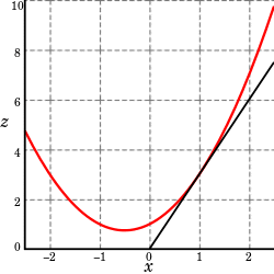 To find the slope of the line tangent to the function at and parallel to the -plane, we treat as a constant. The graph and this plane are shown on the right. Below, we see how the function looks on the plane . By finding the derivative of the equation while assuming that is a constant, we find that the slope of at the point is: