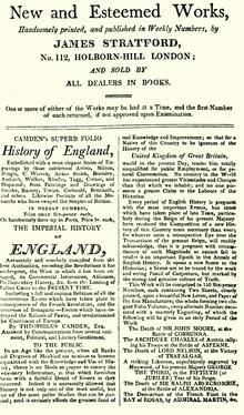 With the advent of printing, serialized publication came into use by printers and publishers. Between 1728 and 1732, Nicolas Tindal's English translation of Paul de Rapin's L'Histoire d'Angleterre (The History of England) was issued by a London printer in monthly parts. A rival printer then tried to compete by selling another translation of de Rapin's work in weekly, six-penny installments.[2] An edition of Foxe's Book of Martyrs was issued in three-penny installments in 1732.[2] At the time, printing a book was a lengthy process, copies of each section of the book being printed in turn until the work was complete; the sections would then be collated and the print-run of books could then be sold. The alternative of selling individual sections as soon as they were printed would enable the printer could gain a steady income while the book was being produced, and potentially increase sales by selling to people who could not afford the upfront cost of a copy of the complete book.