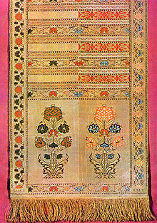 Slutsk sash is declared to be a cultural heritage of Belarus.[1] Kontush Sash an Attribute of a Nobleman. THe Kontush Sash (belt) has an oriental provenance rooted in Persian and Turkish tradition. Continual contact between the Polish–Lithuanian Commonwealth and Persia and even more with Turkey developed vast trade roots and raised popular interest in oriental art and decoration all over “Eastern” Europe. The Ideology of Sarmathism created in the XVIc a wide super-ethnos embracing many Central European nations. The Kontush Belt was a visual manifestation of Sarmathian identity and was widely popular in Lithuania and Belarus, in Poland, Ukraine, Hungary, Saxony, Moldavia, Besarabia and some parts of Russia. Kontush belts were worn by the Nobility, Cossack elders and high municipal officials. The time of prosperity during the period of XVI – XVIIIc created surplus financial resources often channeled into culture, art and decoration. Polish Armenian merchants imported objects of luxury: oriental carpets, weapons decorated with gold and stones, expensive fabrics. Kontush belts especially emphasized the status of the bearer and were unusually expensive. At a certain moment the demand for Kontush belts became so large that it was necessary to open local manufacturing on the territory of the Polish–Lithuanian Commonwealth. The workshops producing Kontush Belts in Slutsk, Grodno, Lvov, Vilnius, Buchach, Kobylki, Kraków, Gdansk, Lipkow were opened mostly by Polish–Lithuanian Armenians. The belts that were made there still had a lot of oriental ornamentation, but had their own distinct character – different from the belts formerly imported from Persia and Turkey. There was a practical aspect to the belt as well. Folded in half and wrapped around the body, it served as a pocket for money and documents. Most belts are about 30 cm wide and around 3,5m long. As a result of the weaving technique – one side of the belt was a negative of the other. This way it was possible for the belt to have two different color schemes (so called two-sided belt). Further division of the belt allowed for four color compositions (four-sided belt). The price of the belt depended on the materials used (sometimes they added silver and gold thread). The complexity of the design raised the price even more since it required more complicated manufacturing machinery, higher qualifications of the craftsmen and a longer production cycle. The four-sided belts were the most expensive. They were meant to be worn on different occasions: bright side – for weddings, dark side for funerals, green side for the green kontush etc. Very often the belt served as a table decoration – it was placed on the center atop the table cloth.