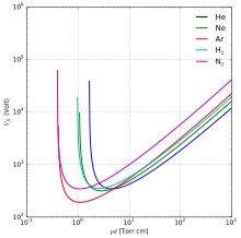 The graph of this equation is the Paschen curve. By differentiating it with respect to and setting the derivative to zero, the minimal voltage can be found. This yields