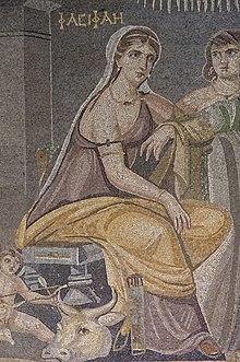 Pasiphaë was the daughter of Perse (one of the Oceanid nymphs[3]) and Helios, the god of the Sun.[4] She was thus the sister of Aeëtes, Circe and Perses. In some accounts, Pasiphaë's mother was identified as the island-nymph Crete herself.[5][6] Like her doublet Europa, the consort of Zeus, her origins were in the East, in her case at Colchis; she was the sister of Circe, Aeëtes and Perses of Colchis, and she was given in marriage to King Minos of Crete. With Minos, she was the mother of Acacallis, Ariadne, Androgeus, Glaucus, Deucalion, Phaedra, Xenodice, and Catreus. She was also the mother of "star-like" Asterion, called the Minotaur.