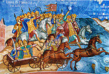 The theme of Moses crossing the Red Sea was taken up by the panegyrists of Constantine the Great and applied to the battle of the Milvian Bridge (312). The theme enjoyed a vogue during the fourth century on carved sarcophagi: at least twenty-nine have survived in full or in fragments.[23] Eusebius of Caesarea cast Maxentius, drowned in the Tiber, in the role of Pharaoh, both in his Ecclesiastical History and in his eulogistic Life of Constantine.[24]