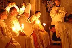 The candles of those present are lit from the Paschal candle. As this symbolic "Light of Christ" spreads throughout those gathered, the darkness is decreased. A deacon, or the priest if there is no deacon, carries the Paschal Candle at the head of the entrance procession and, at three points, stops and chants the proclamation "The Light of Christ" (until Easter 2011, the official English text was "Christ our Light"), to which the people respond "Thanks be to God." Once the procession concludes with the singing of the third proclamation, the lights throughout the church are lit, except for the altar candles. Then the deacon or a cantor chants the Exultet (also called the "Easter Proclamation"), After that, the people put aside their candles and sit down for the Liturgy of the Word.