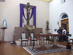 In Methodist and Lutheran churches, the altar has black paraments or the altar cloths are removed altogether.[20][21] Methodist custom holds that apart from depictions of the Stations of the Cross, other images (such as the altar cross) continue the Lenten habitude of being veiled.[22] At the conclusion of the Maundy Thursday liturgy in Lutheran Churches, the "lectern and pulpit are [also] left bare until Easter to symbolize the humiliation and barrenness of the cross."[23] In the Catholic Church, the altars of the church (except the one used for altar of repose) are later stripped quite bare and, to the extent possible, crosses are removed from the church or veiled in the pre-Vatican II rite, crucifixes and statues are covered with violet covers during Passiontide, but the crucifix covers can be white instead of violet on Maundy Thursday).[24]