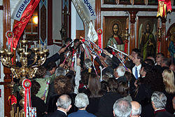 In the Catholic Church, on this day the private celebration of Mass is forbidden.[14] Thus, apart from the Chrism Mass for the blessing of the Holy Oils that the diocesan bishop may celebrate on the morning of Holy Thursday, but also on some other day close to Easter, the only Mass on this day is the evening Mass of the Lord's Supper, which inaugurates the period of three days, known as the Easter Triduum, that includes Good Friday (seen as beginning with the liturgy of the preceding evening), Holy Saturday and Easter Sunday up to evening prayer on that day.[15] The Chrism Mass, whose texts the Roman Missal as well as the rubrics used in the Lutheran Churches now gives under Maundy Thursday, but before the Paschal Triduum, which begins that evening, may be brought forward early in Holy Week, to facilitate participation by as many as possible of the clergy of the diocese together with the bishop.[16] This Mass was not included in editions of the Roman Missal before the time of Pope Pius XII. In this Mass, the bishop blesses separate oils for the sick (used in Anointing of the Sick), for catechumens (used in Baptism) and chrism (used in Baptism, but especially in Confirmation and Holy Orders, as well as in rites such as the dedication of an altar and a church).