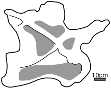 Most of the postcranial skeleton is known in Patagosaurus. The cervical, caudal, and dorsal vertebrae are generally similar to Camarasaurus, although the sacrum possesses many distinct features. The sacrum is well-preserved, showing that Patagosaurus possessed five sacral vertebrae. All the vertebrae but the fifth are fused together. All the neural spines are tall, and the centra are occasionally transversely narrow. The neural canal of the vertebrae is unique among sauropods however. Starting from the very end of the first vertebra, and extending to almost the end of the third there is an enlargement of the canal, forming a well-defined cavity. Even though the sacrum itself is distinguishing, its sacral ribs resemble Camarasaurus. The sacral vertebrae have a total length of 540 mm (21 in), with the total sacral length being 920 mm (36 in).[2]