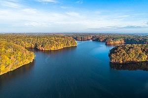 Patapsco Valley State Park extends along 32 miles (51 km) of the Patapsco and its branches, encompassing a total of 14,000 acres (5,700 ha) in five different areas. The river cuts a gorge 100–200 feet (35–70 m) deep within the park, which features rocky cliffs and tributary waterfalls. Bloede's Dam, a hydroelectric dam built in 1906, was located on the Patapsco River within the Park. It was a nearly complete barrier to anadromous fish passage. Although a fish ladder was installed in 1992, it blocked five of six native fish species trying to run upstream to spawn.[12] Impetus to remove Bloede's Dam began in the 1980s when nine drowning deaths occurred, and also to restore fish passage to a large portion of the Patapsco River watershed.[13][14] Dam demolition began on September 12, 2018, opening the fishery and creating a rocky rapid for kayaking.[15] Two dams upstream of Bloede's Dam, Simkins and Union, were removed in 2010.[16][8] The removal of Bloede's Dam leaves Daniels Dam, 9 miles (14 km) upstream, as the last remaining dam along the mainstem Patapsco River.[12]