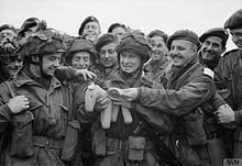 The 22nd Independent Parachute Company were the lead elements of the 6th Airborne Division's drop into Normandy as part of Operation Tonga in the early hours of D-Day, 6 June 1944.[4] The company, together with the rest of the division, remained in Normandy, acting as standard line infantry, until the 6th Airborne Division's advance to the River Seine in August, returning to England in September but was sent to Belgium in December, due to the German Ardennes offensive, again fighting as standard infantrymen. The company then participated in Operation Varsity, the airborne component of Operation Plunder, the British assault crossing of the Rhine in late March 1945 and then took part in the Western Allied invasion of Germany.[2]