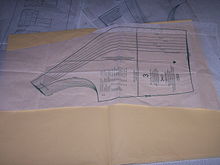 The making of industrial patterns begins with an existing block pattern that most closely resembles the designer's vision.[5] Patterns are cut of oak tag (manila folder) paper, punched with a hole and stored by hanging with a special hook. The pattern is first checked for accuracy, then it is cut out of sample fabrics and the resulting garment is fit-tested. Once the pattern meets the designer's approval, a small production run of selling samples is made and the style is presented to buyers in wholesale markets. If the style has demonstrated sales potential, the pattern is graded for sizes, usually by computer with an apparel industry specific CAD program. Following grading, the pattern must be vetted; the accuracy of each size and the direct comparison in laying seam lines is done. After these steps have been followed and any errors corrected, the pattern is approved for production. When the manufacturing company is ready to manufacture the style, all of the sizes of each given pattern piece are arranged into a marker, usually by computer. A marker is an arrangement of all of the pattern pieces over the area of the fabric to be cut that minimizes fabric waste while maintaining the desired grainlines. It's sort of like a pattern of patterns from which all pieces will be cut. The marker is then laid on top of the layers of fabric and cut. Commercial markers often include multiple sets of patterns for popular sizes. For example: one set of size Small, two sets of size Medium and one set of size Large. Once the style has been sold and delivered to stores – and if it proves to be quite popular – the pattern of this style will itself become a block, with subsequent generations of patterns developed from it.[5]