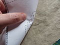 Sewing a tailor's tack with thread to mark a pattern on fabric before cutting the fabric