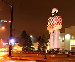 - Statues of Bunyan (alone) exist in Old Forge, New York; Akeley, Minnesota; Tucson, Arizona; Minocqua, Wisconsin; Bangor, Maine; Rumford, Maine; Oscoda, Michigan; Manistique Township, Michigan; a recently moved pair of statues sit in Ossineke, Michigan with a neutered Babe the Blue Ox,[16] Portland, Oregon; St. Maries, Idaho; Shelton, Washington; Lake Nebagamon, Wisconsin; Aline, Oklahoma; and also on top of a Vietnamese (May Cafe 111 Louisiana Blvd. SE 87108) restaurant in Albuquerque, New Mexico.