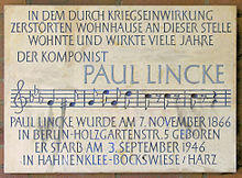 Lincke's ailing health was worsened by the climate there, and he moved again to Hahnenklee. He died there shortly before his 80th birthday. His funeral was held in Hahnenklee, where his grave is still maintained today.