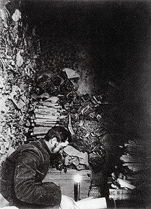 Pelliot stayed in Hanoi until 1904, when he returned to France in preparation for representing the EFEO at the 1905 International Conference of Orientalists in Algiers.[3] While in France, Pelliot was chosen to direct a government-sponsored archaeological mission to Chinese Turkestan (modern Xinjiang).[3] The group departed in June 1906 and spent several years in the field (see below).[3] By the time the expedition reached Dunhuang, Pelliot had learned Mongolian, Arabic, Persian, the Turkic languages, Tibetan, and Sanskrit, among others, which proved invaluable while examining the many non-Chinese items among the Dunhuang manuscripts inside the Mogao caves.[4]