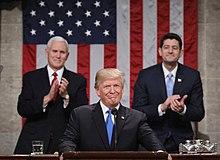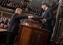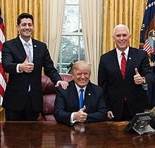 In May 2017, Ryan said Congress' goal was "calendared 2017 for tax reform" and reported progress was being made in doing so.[112] In December 2017, both houses of Congress passed a $1.5 trillion tax bill called the Tax Cuts and Jobs Act of 2017, which Trump signed into law on December 22.[113] The tax law is projected to add an additional $1.5 trillion to the national debt over a decade, but the nonpartisan Joint Committee on Taxation also estimated that the GDP level on average would be 0.7% higher during the same period.[114][115][116] In the weeks leading up to his retirement announcement, Ryan also championed a $1.3 trillion government-wide spending bill that boosted military spending significantly.[117] Politico noted that Ryan "clamored for austerity when he's been in the minority, trashing Democrats as profligate budget-busters, but he's happily busted budgets in the majority."[114]