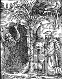 Paul of Thebes is known to posterity because around the year 342, Anthony the Great was told in a dream about the older hermit's existence, and went to find him.[9] Jerome related that Anthony the Great and Paul met when the latter was aged 113. They conversed with each other for one day and one night. The Synaxarium shows each saint inviting the other to bless and break the bread, as a token of honor. Paul held one side, putting the other side into the hands of Father Anthony, and soon the bread broke through the middle and each took his part. When Anthony next visited him, Paul was dead. Anthony clothed him in a tunic which was a present from Athanasius of Alexandria and buried him, with two lions helping to dig the grave.[9]