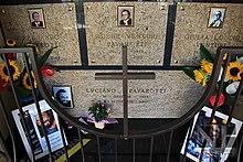 Pavarotti's funeral was held at Modena Cathedral. The then Prime Minister Romano Prodi and Kofi Annan attended.[49] The Frecce Tricolori, the aerobatic demonstration team of the Italian Air Force, flew overhead, leaving green-white-red smoke trails. After a funeral procession through the centre of Modena, Pavarotti's coffin was taken the final ten kilometres (6 miles) to Montale Rangone, a village part of Castelnuovo Rangone, and was interred in the Pavarotti family crypt. The funeral, in its entirety, was also telecast live on CNN. The Vienna State Opera and the Salzburg Festival Hall flew black flags in mourning.[50] Tributes were published by many opera houses, such as London's Royal Opera House.[51]