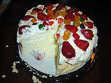 ![]() A pavlova typically garnished with strawberries, passionfruit, kiwifruit and cream | |