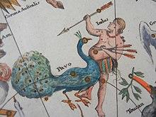 According to Mark Chartrand, former executive director of the National Space Institute, Plancius may not have been the first to designate this group of stars as a peacock: "In Greek myth the stars that are now the Peacock were Argos [or Argus], builder of the ship Argo. He was changed by the goddess Juno into a peacock and placed in the sky along with his ship."[6][7] Indeed, the peacock "symboliz[ed] the starry firmament" for the Greeks,[8] and the goddess Hera was believed to drive through the heavens in a chariot drawn by peacocks.[9]