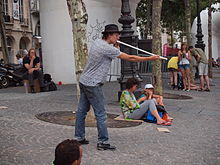 Peashooting (sometimes spelled pea-shooting or pea shooting) is the act of shooting dried peas out of a tube, a peashooter, by blowing through it. A similar effect can be achieved by using small bits of paper instead of peas. A sport has developed around pea shooting, in which peas are shot into a target, similar to those used for archery. The target may be made of a soft substance (putty) so that the peas will stick into it or at least make indentations that easily identify the location of the hit. The World Pea Shooting Championships are held annually in the village of Witcham, UK.[1]