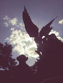 The sculpture depicts the struggle of good and evil, as well as a battle between the Archangel Michael and Satan. The sculpture also contains the Sun, the Moon, and several animals. Although it is called a fountain, there is currently no water on the site. A plaque at the base contains the following inscription: