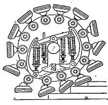 The pedrail wheel is a type of all-terrain wheel developed in the late 19th and early 20th century by Londoner Bramah Joseph Diplock. It consists of a series of "feet" (pedes in Latin) connected to pivots on a wheel. As the wheel travels, pressure exerted by springs within it increases the number of feet in contact with the ground, thus reducing ground pressure and allowing the wheel to negotiate obstacles and uneven ground.