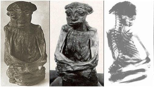 The San Pedro Mountains mummy(known informally as Pedro) is a mummy discovered in Wyoming. Due to its unusual physical features and small stature, it has become a part of American folklore as well as UFOlogy and cryptozoology. Mainstream scientific opinion considers "Pedro" to be the mummy of a malformed infant that was born with anencephaly.