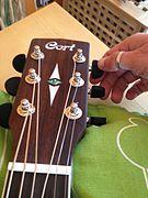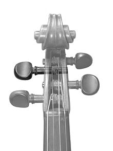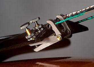 Fine tuners are not geared. They have a screw with a knurled head, whose lower end advances against one end of a lever with a right-angle bend in it. The string is fastened to the other end of the lever, and tightening the screw tightens the string.[8] With the screw at the lower limit of its travel, the lever can come close enough to the instrument's top to pose a risk of scarring it.[9] To avoid damage to the top, the screw may be turned out as far as it goes while still engaging the lever, and the string re-tuned using the peg.[10]
