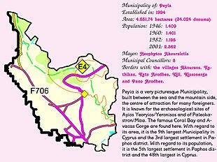 Peyia (also spelt Pegeia; Greek: Πέγεια) is a town in the Paphos District of Cyprus. Pegeia is situated mainly on the steep slopes of the coastal hills inland from Coral Bay, at the southern end of the Akamas Peninsula, and it lies 14 km northwest of Paphos. It has a large population of British immigrants and a growing number of holiday homes and apartments. In the town centre can be found the town hall, a church, a police station and several small shops, restaurants and banks. Due to its hillside location many parts of the town offer views over Coral Bay and Paphos.