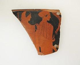 Pindar refers to courtesans and prostitutes in Corinth as "the servants of Peitho", however, he does not elaborate on whether there was any cults associated with Peitho in the city nor whether courtesans had a particular reverence for the goddess.[30] This passage has stirred debate among scholars one whether sacred prostitution was practiced in Greece.[29] Peitho was commonly shown wearing jewelry, fixing her clothing, holding jars of perfume, or looking into mirrors, traits that may be associated with hetairai.[29]