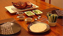Peking duck is a dish from Beijing (Peking)[1] that has been prepared since the Imperial era. The meat is characterized by its thin, crisp skin, with authentic versions of the dish serving mostly the skin and little meat, sliced in front of the diners by the cook. Ducks bred specially for the dish are slaughtered after 65 days and seasoned before being roasted in a closed or hung oven. The meat is often eaten with spring onion, cucumber and sweet bean sauce with pancakes rolled around the fillings. Sometimes pickled radish is also inside, and other sauces (like hoisin sauce) can be used.