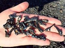 Pele's tears (closest Hawaiian translation: "nā waimaka o pele") are small pieces of solidified lava drops formed when airborne particles of molten material fuse into tearlike drops of volcanic glass. Pele's tears are jet black in color and are often found on one end of a strand of Pele's hair. Pele's tears is primarily a scientific term used by volcanologists.