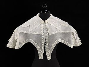 Layered muslin pelerines were popular in the 1830s as an option to drape over the top of the large sleeves fashionable at that period.[7] Along with tippets, they helped emphasise the fashionable width of the sleeves and the shoulderline of the decade.[8]