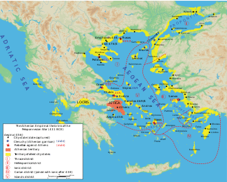 As the preeminent Athenian historian, Thucydides, wrote in his influential History of the Peloponnesian War, "The growth of the power of Athens, and the alarm which this inspired in Lacedaemon, made war inevitable."[7] Indeed, the nearly fifty years of Greek history that preceded the outbreak of the Peloponnesian War had been marked by the development of Athens as a major power in the Mediterranean world. Its empire began as a small group of city-states, called the Delian League – from the island of Delos, on which they kept their treasury – that came together to ensure that the Greco-Persian Wars were truly over. After defeating the Second Persian invasion of Greece in the year 480 BC, Athens led the coalition of Greek city-states that continued the Greco-Persian Wars with attacks on Persian territories in the Aegean and Ionia. What then ensued was a period, referred to as the Pentecontaetia (the name given by Thucydides), in which Athens increasingly became in fact an empire,[8] carrying out an aggressive war against Persia and increasingly dominating other city-states. Athens proceeded to bring under its control all of Greece except for Sparta and its allies, ushering in a period which is known to history as the Athenian Empire. By the middle of the century, the Persians had been driven from the Aegean and forced to cede control of a vast range of territories to Athens. At the same time, Athens greatly increased its own power; a number of its formerly independent allies were reduced, over the course of the century, to the status of tribute-paying subject states of the Delian League. This tribute was used to support a powerful fleet and, after the middle of the century, to fund massive public works programs in Athens, causing resentment.[9]
