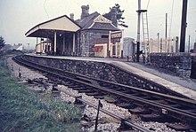 A permanent station building was constructed later, built from dressed limestone with a slate roof and three ornamental chimneys. The building contained five rooms; the Station Master's office, a parcels office, a booking office, a general waiting room and a ladies waiting room.[2] Fully glazed canopies were added over the station entrance and platform in the early 1900s, following the takeover of the Pembroke and Tenby by the Great Western Railway.[3] A new shelter was built in 1971, and the main limestone buildings were demolished. This new shelter was in turn was later replaced with a glass panelled shelter.[4]