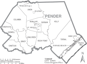 The county was formed in 1875 from New Hanover County. It was named for William Dorsey Pender of Edgecombe County, a Confederate general mortally wounded at the Battle of Gettysburg.[3] It is in the southeastern section of the state and is bounded by the Atlantic Ocean and New Hanover, Brunswick, Columbus, Bladen, Sampson, Duplin, and Onslow Counties. The present land area is 870.76 square miles (2,255.3 km2) and the 2010 population was 52,196, which has nearly doubled since 1990. The estimated county population in 2019 has increased to 63,060. [4] The county commissioners were ordered to hold their first meeting at Rocky Point. The act provided for the establishment of the town of Cowan as the county seat. In 1877, an act was passed repealing that section of the law relative to the town, and another law was enacted whereby the qualified voters were to vote on the question of moving the county seat to South Washington or any other place which the majority of the voters designated. Whatever place was selected, the town should be called Stanford. In 1879, Stanford was changed to Burgaw, which was by that law incorporated. It is the county seat. The stretch of I-40 through the county is a notorious speed trap.[5]