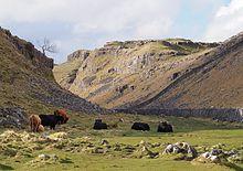 From Middleton the path ascends Teesdale on the right bank of the River Tees, below the village of Holwick. It passes the waterfalls of Low Force and High Force, and reaches the scattered settlement of Forest-in-Teesdale. Further up the Tees, the path climbs beside the waterfall of Cauldron Snout below the dam of Cow Green Reservoir. The trail then ascends the gently rising side valley of Maize Beck to reach High Cup Nick, one of the most photographed areas on the Pennine Way. From High Cup the trail descends to the village of Dufton.[25]