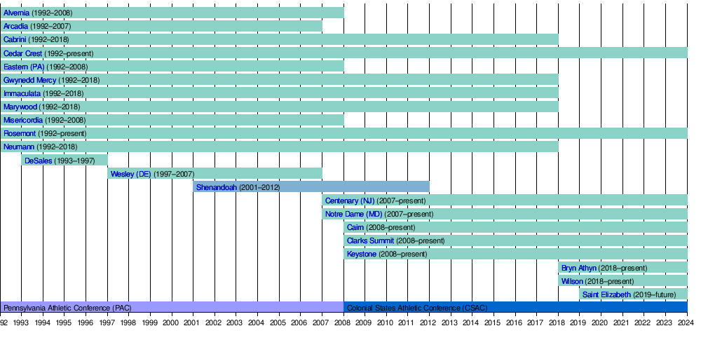 The Colonial States Athletic Conference (CSAC) is an NCAA Division III collegiate athletic conference in the Mid-Atlantic United States. There are currently nine full member institutions as of 2018. The conference's membership, as with most Middle Atlantic conferences, was shaken as a result of the formation of the Landmark Conference and its ensuing domino effect. The conference, founded in 1992 as the Pennsylvania Athletic Conference, changed its name in 2008.[1]