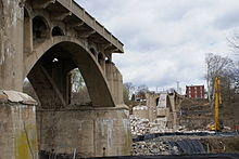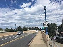The northern terminus of PA 113 was realigned to its current location at US 611 (now PA 611) in 1946, replacing a portion of PA 413. The former alignment of PA 113 east of Kulps Corner became PA 313 between Kulps Corner and Doylestown, solely US 202 between Doylestown and Buckingham, PA 413 between Buckingham and Penndel, PA 513 between Penndel and Hulmeville, and present-day Bensalem Boulevard between Hulmeville and US 13.[11] PA 113 was slightly re-routed in the 1970s when a bypass was constructed around Kimberton. The historic roadbed is currently Kimberton Road and Hares Hill Road.[12] In the 1980s, PA 113 was rerouted to bypass the center of Harleysville, eliminating a short concurrency with PA 63.[13] In 2008, the structurally deficient Gay Street Bridge over the French Creek in Phoenixville, built in 1924, was closed and demolished in a project to build a new bridge.[14][15] The new Gay Street Bridge opened in fall 2009 at a cost of $17 million.[15]