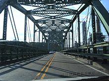 In 1911, what would become PA 21 was designated as part of Legislative Route 256 between the West Virginia border and Rogersville, Legislative Route 111 between Rogersville and Waynesburg, and Legislative Route 112 between Waynesburg and Uniontown.[7] PA 21 was designated in 1927 to run from the West Virginia border east to US 40 in Uniontown. The route followed its current alignment to west of Carmichaels, where it headed east by way of Carmichaels and New Salem to Uniontown. The alignment utilized a ferry across the Monongahela River.[8][9] By the time of its inception, PA 21 existed as a paved road between Wind Ridge and PA 121 east of Waynesburg, in the Carmichaels area, and from south of Republic to Uniontown.[9] The remainder of PA 21 was paved by 1940.[10] By 1950, PA 21 was rerouted to follow PA 88 between Carmichaels and Paisley, where it turned east and crossed the Monongahela River at Masontown and followed its current alignment to Uniontown.[11] Bypasses of Carmichaels and Masontown were built by 1960. Also by this time, PA 21 was widened into a divided highway near the PA 88 intersection in Paisley,[12] By 1970, a portion of PA 21 east of Waynesburg was converted to a divided highway.[13] A new, four-lane Masontown Bridge over the Monongahela River was completed in 2015. It replaced the two-lane bridge built in 1925.[14]
