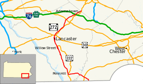 PA 272 is mostly in Lancaster County, except for about a mile at the northern terminus where it enters Berks County and the southernmost part of the route, which is in Chester County. Through the city of Lancaster, it is unsigned but concurrent with US 222.[2][3][4][5]