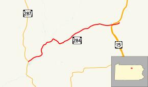 A road in the location of PA 284 first shows on maps as early as 1873.[3] PA 284 was first designated along its current alignment during the 1928 renumbering of state highways in Pennsylvania. The designation was done as a spur to the alignment of PA 84, which was designated from Piatt Township to the New York state line.[4] The entire alignment of PA 284 was paved by the Pennsylvania Department of Highways in 1932, including the bridge over Flooks Run and Blacks Creek.[5] However, the alignment has remained relatively unchanged since. In 1961, with the designation of Interstate 84, the alignment of PA 84 was re-designated as PA 287 to avoid duplication.[6] In 1974, PA 284 was adjusted for the construction of the new U.S. Route 15 alignment. This was adjusted in 1998 with the construction of U.S. Route 15 for preparations to convert the route to Interstate 99.[7]