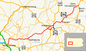 Pennsylvania Route 286 Truck is a 7-mile-long (11 km) truck route in Indiana County, Pennsylvania.[3] The route starts at the interchange of PA 286 on US 422/PA 56. After a short distance, the route heads north on US 119. The route eventually goes west, and eventually meets up again with PA 286 just east of Indiana.